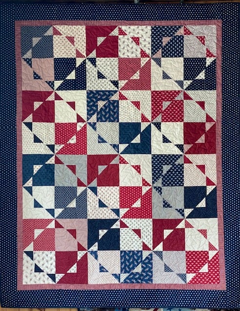 Quilt is the Lap size (63″ x 80″), featuring fabrics from the Moda line American Gatherings III by Lisa Bongean of Primitive Gatherings.